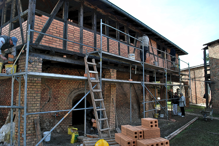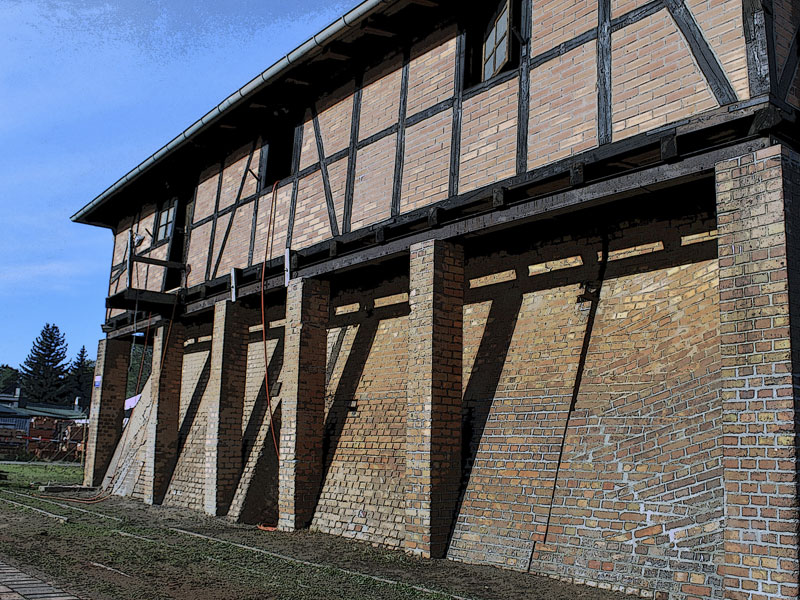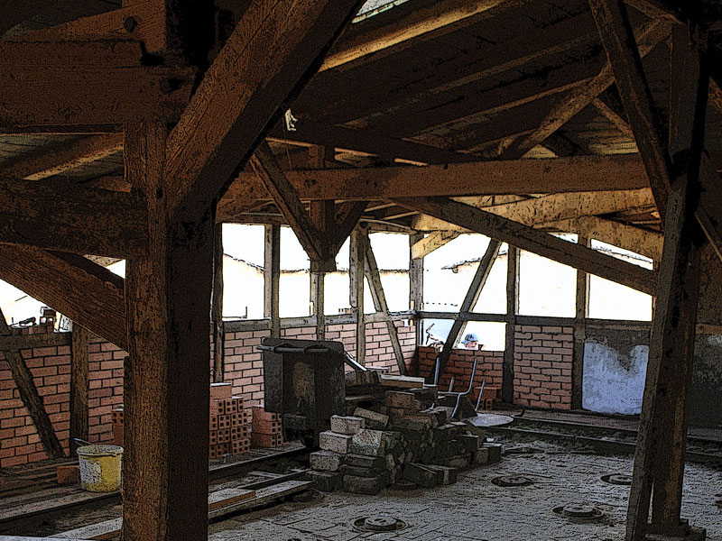 Im Weiteren wurde ein Vorschlag für eine vorübergehende Konservierungsmaßnahme für die verformten Dachkonstruktionen unterbreitet. Kernpunkt des Sanierungskonzeptes ist die Instandsetzungsplanung sowohl für die Dachgeschosskonstruktion, als auch für das erdgeschossige Mauerwerk. Sie stellt eine bauerhaltende, denkmalpflegerisch verträgliche Maßnahme zur Konservierung und Sanierung des Bauwerkes dar.