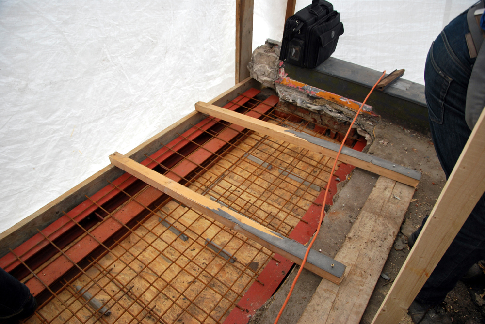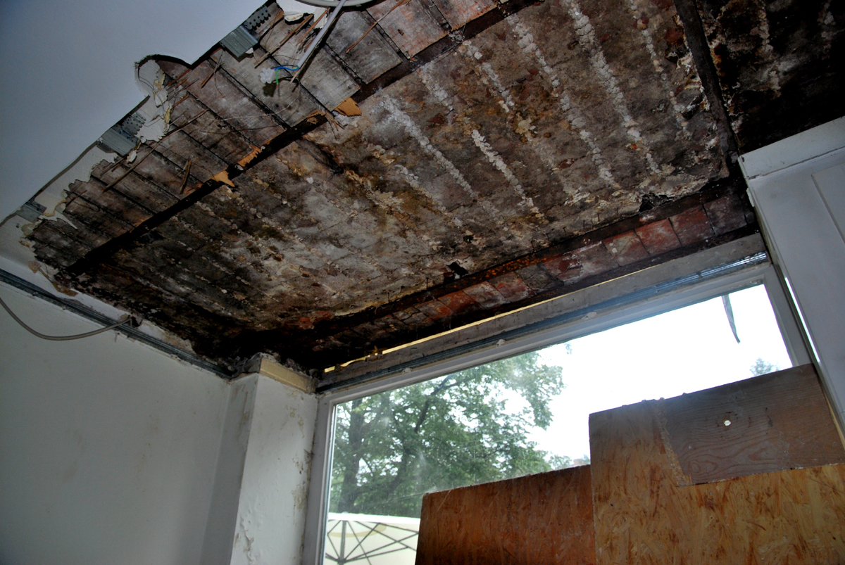 Während mehrerer Ortstermine wurde festgestellt, dass Teile der Gesims- und Deckenkonstruktionen des erdgeschossigen Vorbaus aufgrund einer Leckage durch Feuchte geschädigt und abgängig sind. Die Decke über dem Erdgeschoss war in diesem Bereich als Stahlsteindecke ausgebildet. Die betroffenen Bauteile wurden zurückgebaut und durch eine neue massive Deckenkonstruktion mit Dämmung und Abdichtungsebene ersetzt. Außerdem wurde eine neue Geländerkonstruktion für die Dachterrasse im Obergeschoss eingebaut.