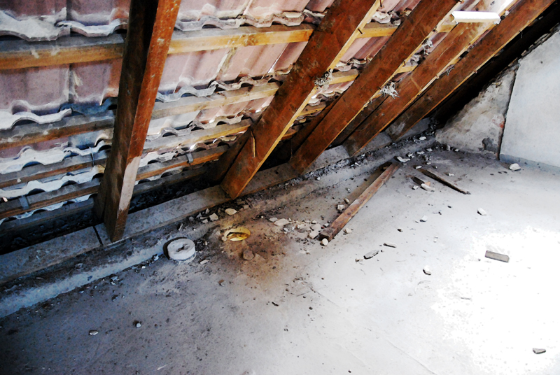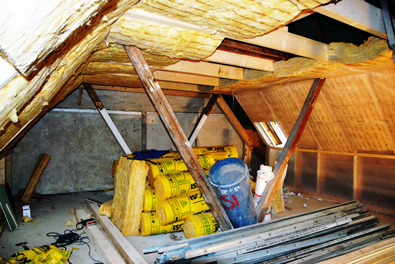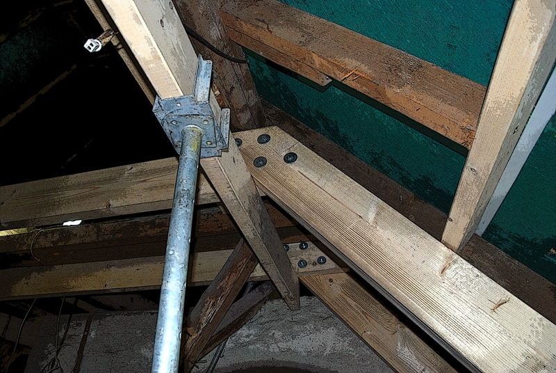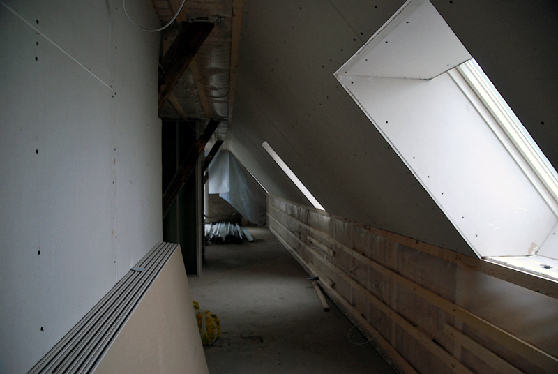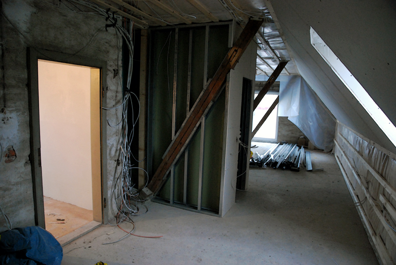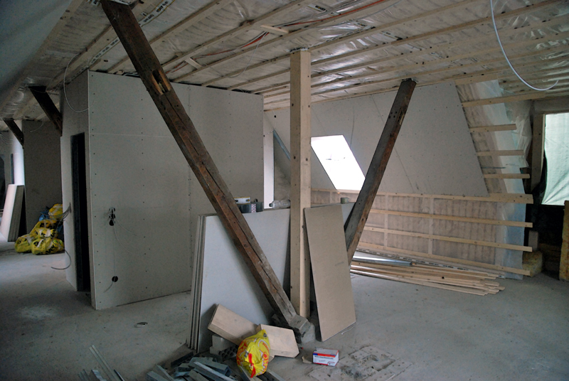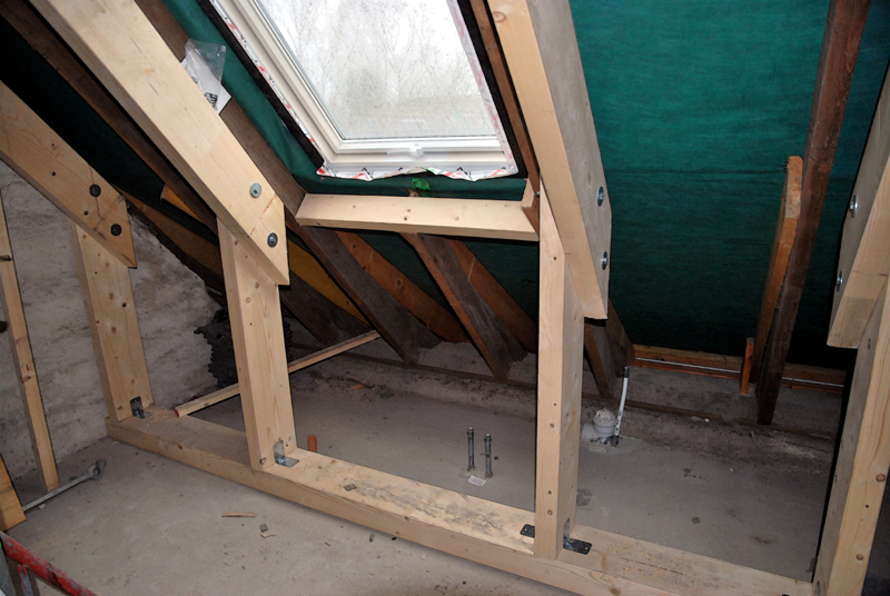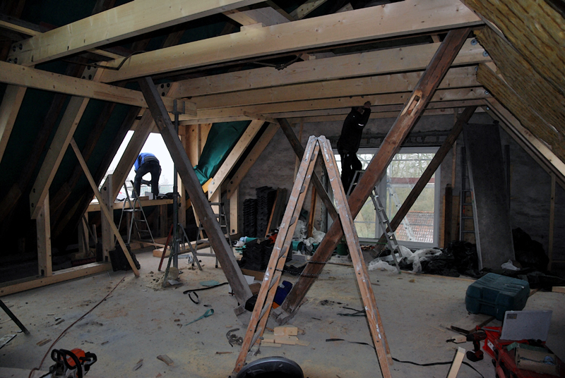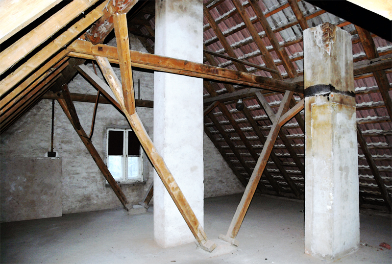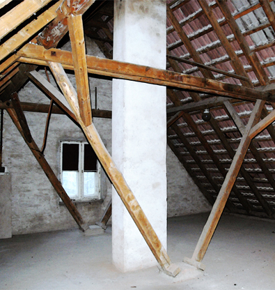 Die innenseitigen Ausbaukonstruktionen für den Dachgeschossausbau mit zwei neuen Gauben an der Ostseite wurden unabhängig von dem vorhandenen Pfettendach errichtet. Sie wurden auf Wänden und der Stahlsteindecke über dem Obergeschoss abgesetzt und lediglich konstruktiv an die hölzernen Dachbauteile angeschlossen. Ein spezieller Nachweis der Tragfähigkeit der betroffenen Stahlsteindecke musste aufgrund der erhöhten Belastung erarbeitet werden.
