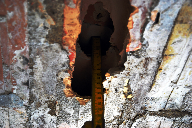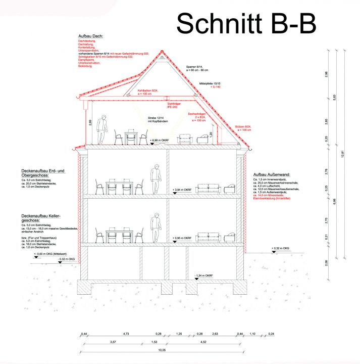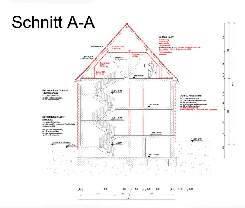 Bei dem Objekt handelt es sich um ein vollständig unterkellertes, zweigeschossiges Mehrfamilienwohngebäude der Gebäudeklasse 3, welches im Jahre 1955 in Massivbauweise errichtet wurde und seit etwa 20 Jahren leer stand. Das hölzerne Satteldach ist als Pfettenkonstruktion mit schrägen Streben ausgebildet, die auf der Decke über dem Obergeschoss abgesetzt sind. Sowohl die Decke über dem Ober-, als auch diejenige über dem Erdgeschoss sind als massive Stahlsteindecken mit Stärken von h = 25 cm konstruiert, die auf Mauerwerkswänden lagern. Die Gebäudeaußenwände bestehen aus zweischaligem Mauerwerk mit Luftschicht. Die Decke über dem Keller ist als massive Gewölbedecke errichtet worden, welche ebenfalls zwischen Mauerwerkswänden spannt. Es wird angenommen, dass die Gründung des Gebäudes durch massive Streifenfundamente unter den tragenden Mauerwerkswänden auf gut tragfähigem Baugrund erfolgt.