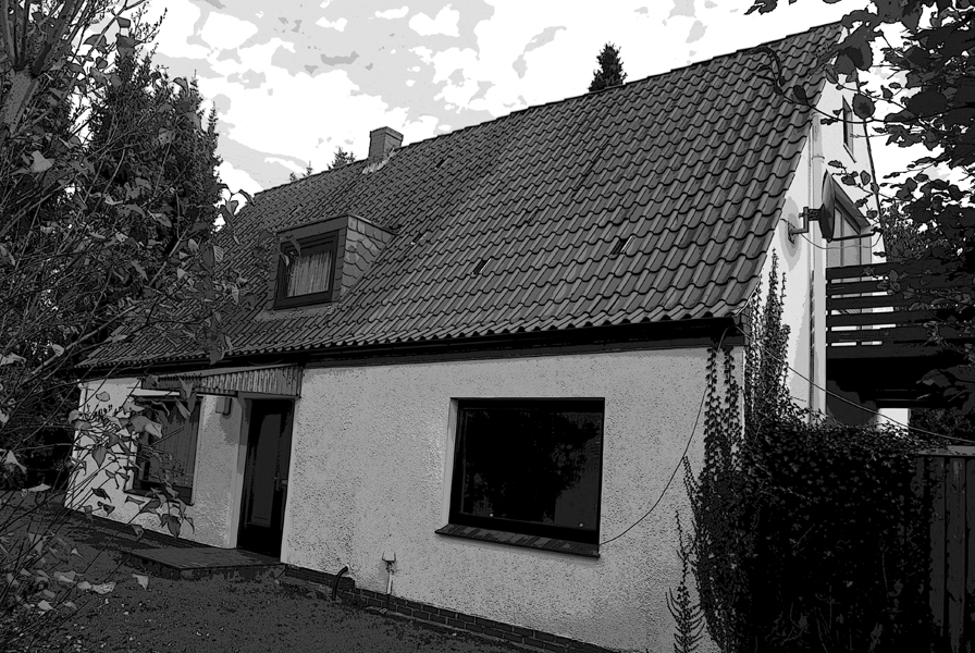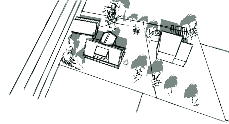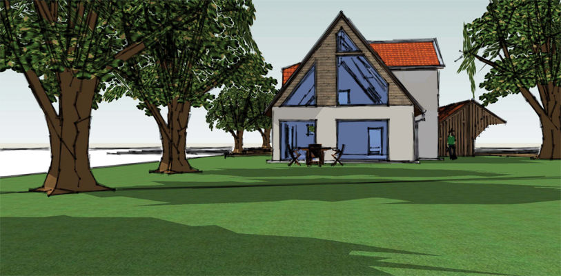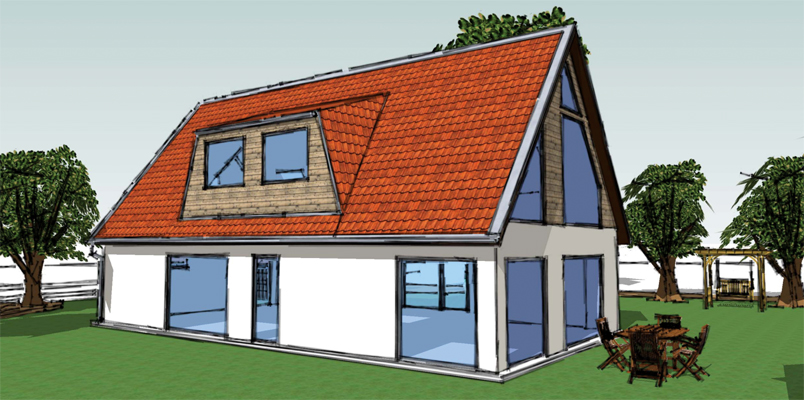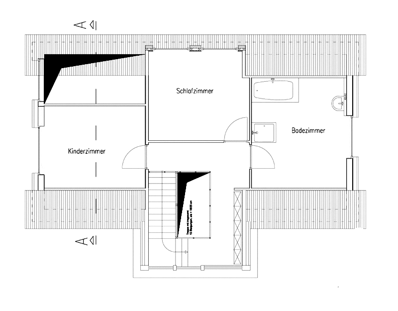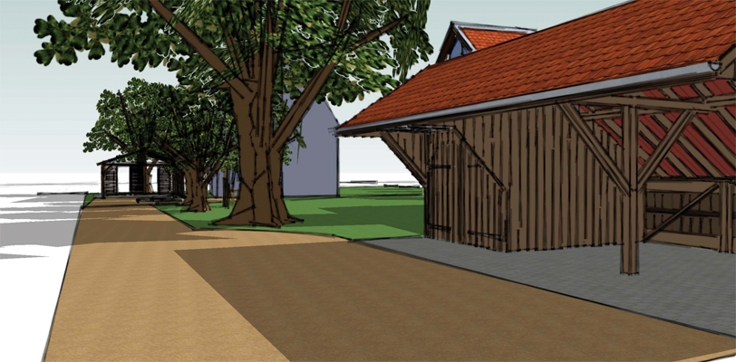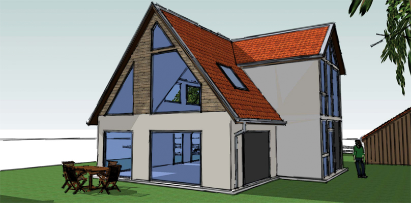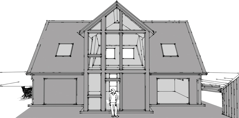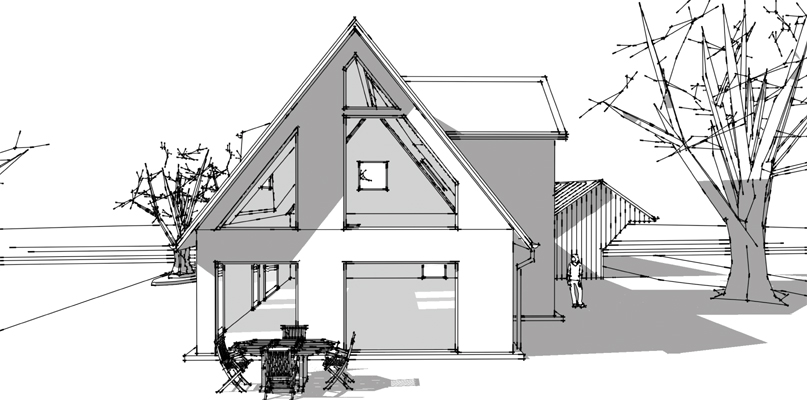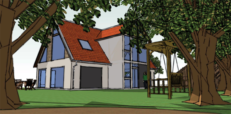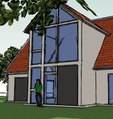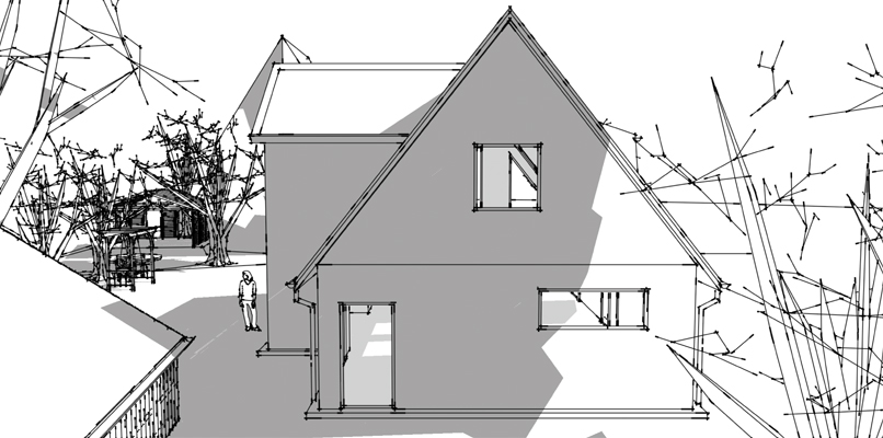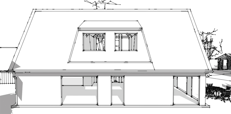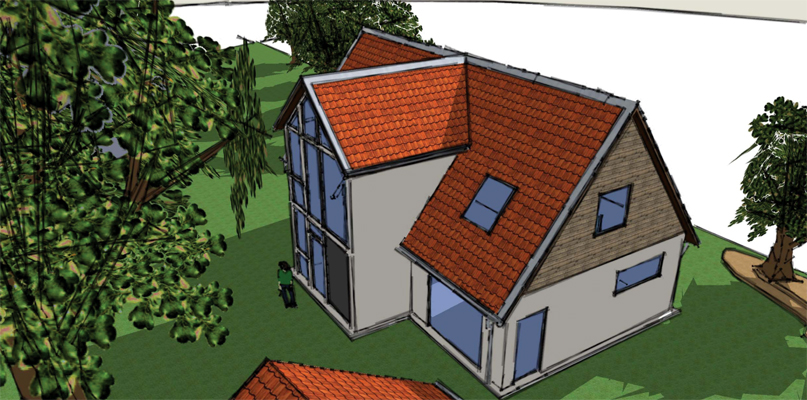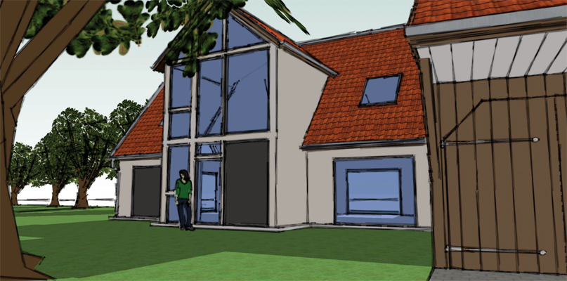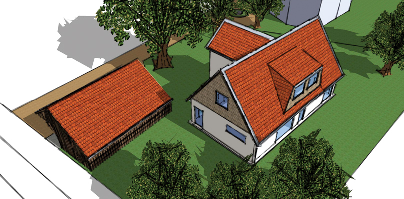 Als Erweiterungsmaßnahmen sind ein Dachausbau in Form einer Gaube an der Westseite und ein Giebelanbau als neuer Eingang an der Ostseite vorgesehen.